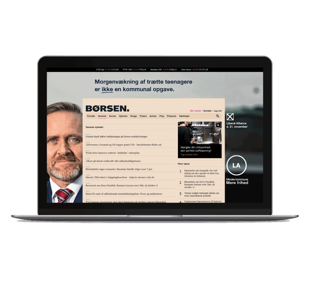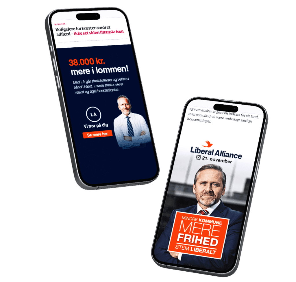 During the general election, we used digital ad placements designed to resemble breaking news banners on the country’s largest news outlets. This generated immediate attention and secured Liberal Alliance a visible position in the media landscape – even as a smaller party.